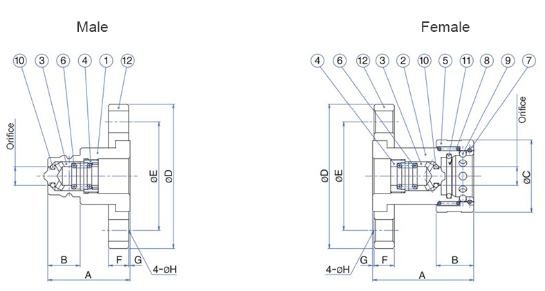 | Part No. | A(mm) | B(mm) | ΦC(mm) | ΦD(mm) | ΦE(mm) | F(mm) | G(mm) | H(mm) | Orifice(mm) | Flange |