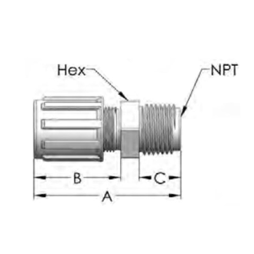 | Part No. | Tube OD | NPT Thread | Orifice | A | B | C | Hex |
